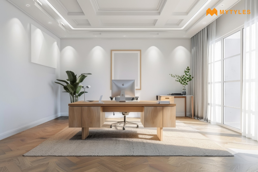 Indian offices are busy. Footsteps, coffee spills, dragging chairs, all of it. That’s why materials like vitrified tiles and ceramic tiles are still the heroes when it comes to best flooring for the office. They last for years, don’t chip easily, and resist stains. Many offices prefer them because maintenance is simple, not a weekly headache.